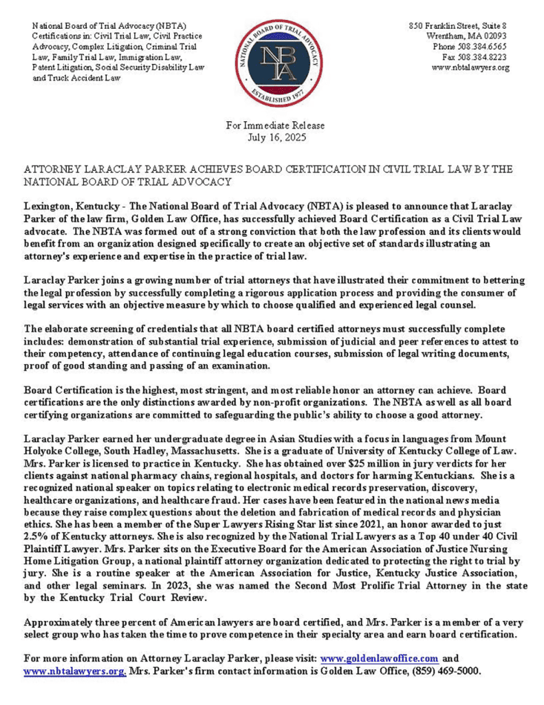 Golden Law Office in Lexington is home to Kentucky personal injury trial attorneys with a long record of proven results. As of September 2025, Kentucky has over 19,000 licensed attorneys, yet only 14 have achieved board certification in Civil Trial Law from the National Board of Trial Advocacy—the highest and most rigorous distinction available in the field. Golden Law Office is proud to have three of those attorneys: J. Dale Golden, Laraclay Parker, and John W. Walters.
